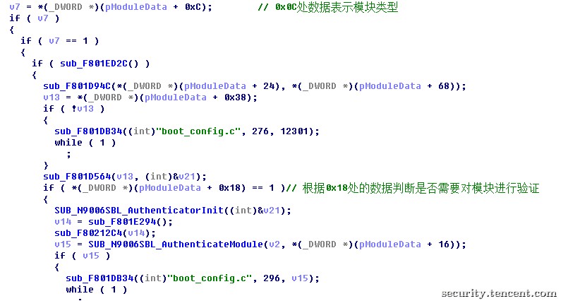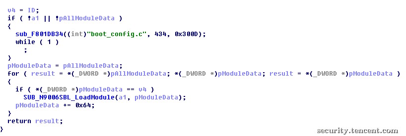 sbl1的功能是对硬件进行初始化并加载其他模块,需要加载的模块信息按顺序保存在sbl1中,对应每个模块的数据是一段大小为0x64字节的模块信息数据内,sbl1中有一个循环负责验证和加载所有需要的其他模块(tz,rpm,wdt,appsbl),加载代码会根据模块信息内的数据调用不同的加载器加载和验证的代码,具体代码如下图。