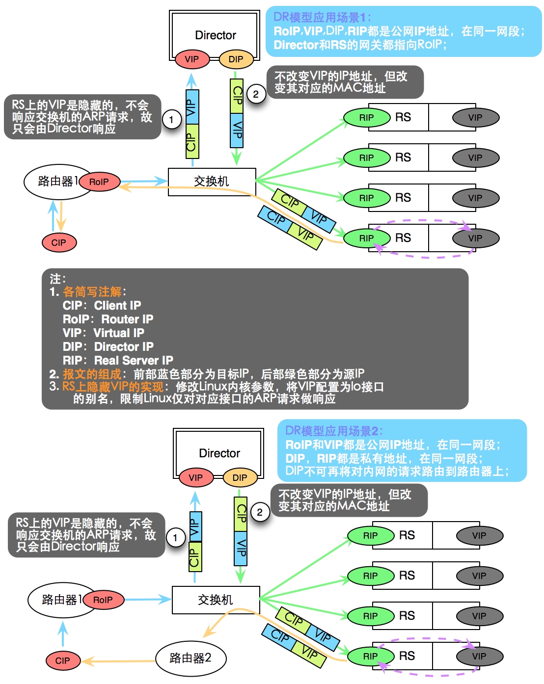 需解决的关键问题: 让前端路由将请求发往VIP时,只能是Director上的VIP进行响应;实现方式是修改RS上的Linux内核参数,将RS上的VIP配置为lo接口的别名,并限制Linux仅对对应接口的ARP请求做响应