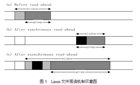 下图是Linux内核预读机制的一个示意图,其中a是某次读操作之前的情况,b是读操作所请求页面不在 window中的情况,而c是读操作所请求页面在window中的情况。