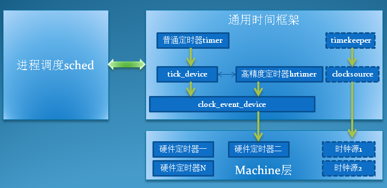 早期的内核版本中,进程的调度基于一个称之为tick的时钟滴答,通常使用时钟中断来定时地产生tick信号,每次tick定时中断都会进行进程的统计和调度,并对tick进行计数,记录在一个jiffies变量中,定时器的设计也是基于jiffies。这时候的内核代码中,几乎所有关于时钟的操作都是在machine级的代码中实现,很多公共的代码要在每个平台上重复实现。随后,随着通用时钟框架的引入,内核需要支持高精度的定时器,为此,通用时间框架为定时器硬件定义了一个标准的接口:clock_event_device,machine级的代码只要按这个标准接口实现相应的硬件控制功能,剩下的与平台无关的特性则统一由通用时间框架层来实现。