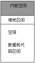 由图可以看出,堆栈空间安排在虚存空间的顶部,运行时由顶向下延伸;代码段和数据段则在低部,运行时并不向上延伸。从数据段的顶部到堆栈段地址的下沿这个区间是一个巨大的空洞,这就是进程在运行时可以动态分配的空间(也叫动态内存)。