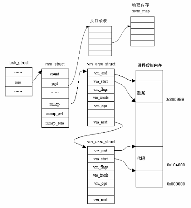 由于上面这些原因,Linux 采用了比较复杂的数据结构跟踪进程的虚拟地址。在进程的 task_struct结构中包含一个指向 mm_struct 结构的指针。进程的mm_struct 则包含装入的可执行映象信息以及进程的页目录指针pgd。该结构还包含有指向 vm_area_struct 结构的几个指针,每个 vm_area_struct 代表进程的一个虚拟地址区间。