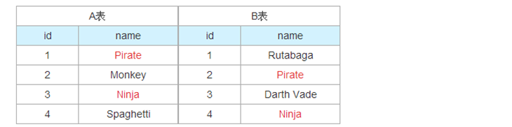 假设我们有两张表。Table A 是左边的表。Table B 是右边的表。其各有四条记录,其中有两条记录name是相同的,如下所示:让我们看看不同JOIN的不同