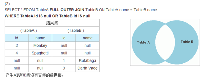 还需要注册的是我们还有一个是“交差集” cross join, 这种Join没有办法用文式图表示,因为其就是把表A和表B的数据进行一个 N*M 的组合,即笛卡尔积。表达式如下:SELECT * FROM TableA CROSS JOIN TableB